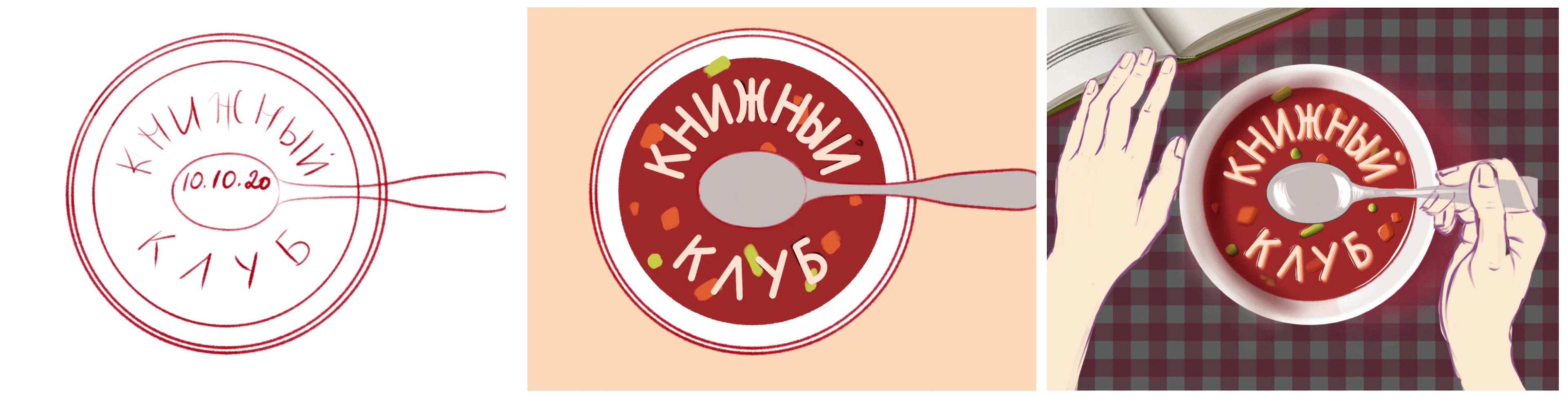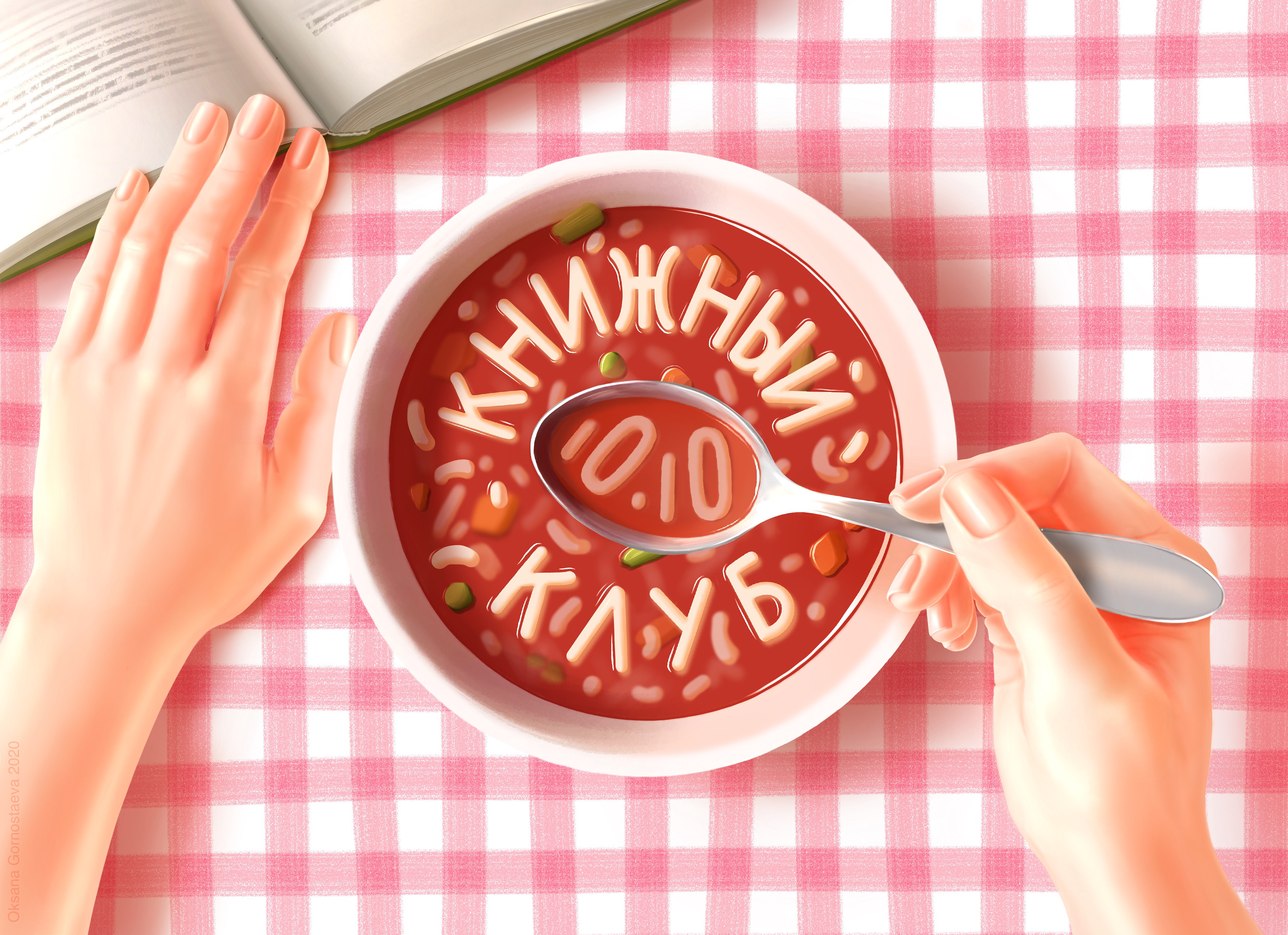 An illustration I made for a book club announcement on social media. It was supposed to communicate love for reading, plus a feeling of coziness. The typography in the soup is the Russian for "Book Club" and the "10.10" in the spoon is the date of the first meeting, it was supposed to be complemented by another indication of the date and time in the final design where the copy with the full information would be added.