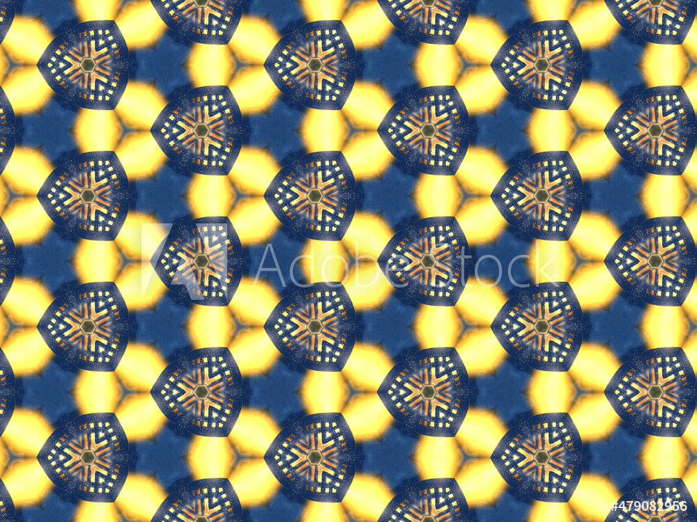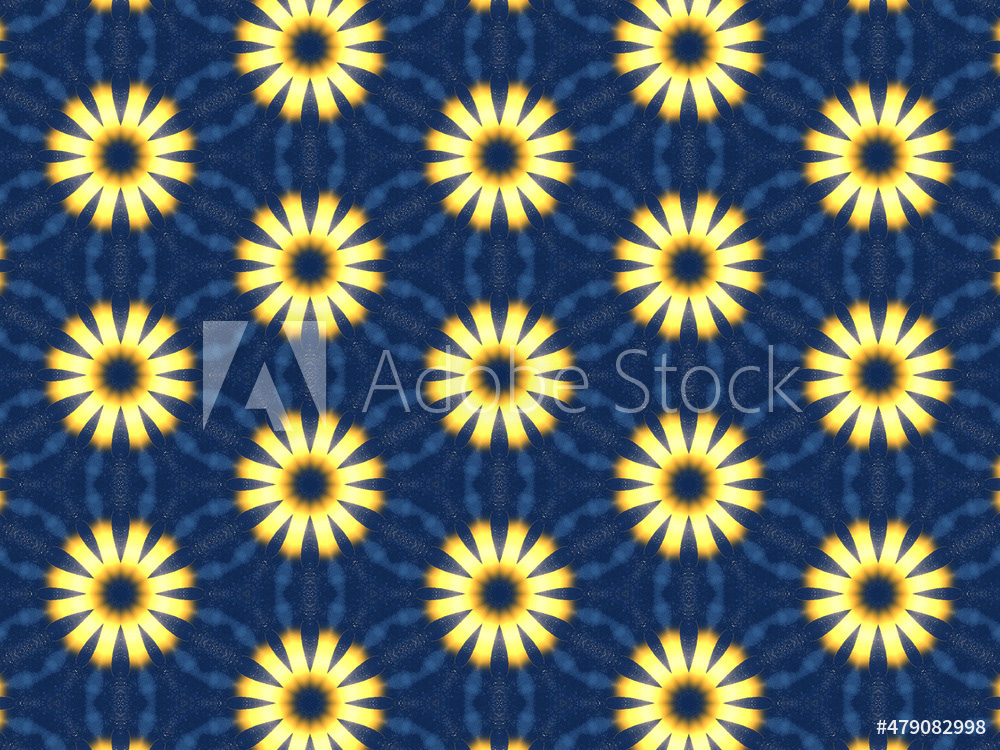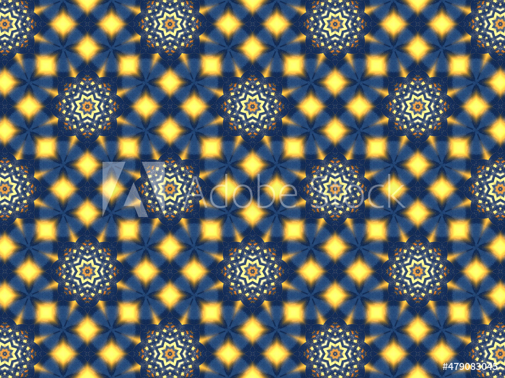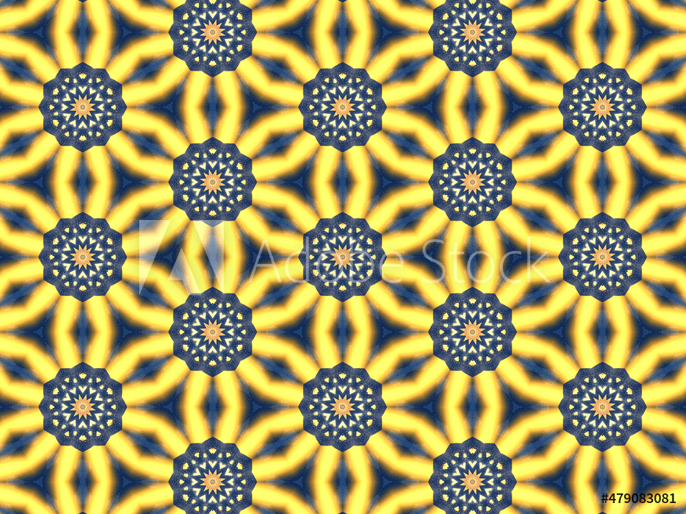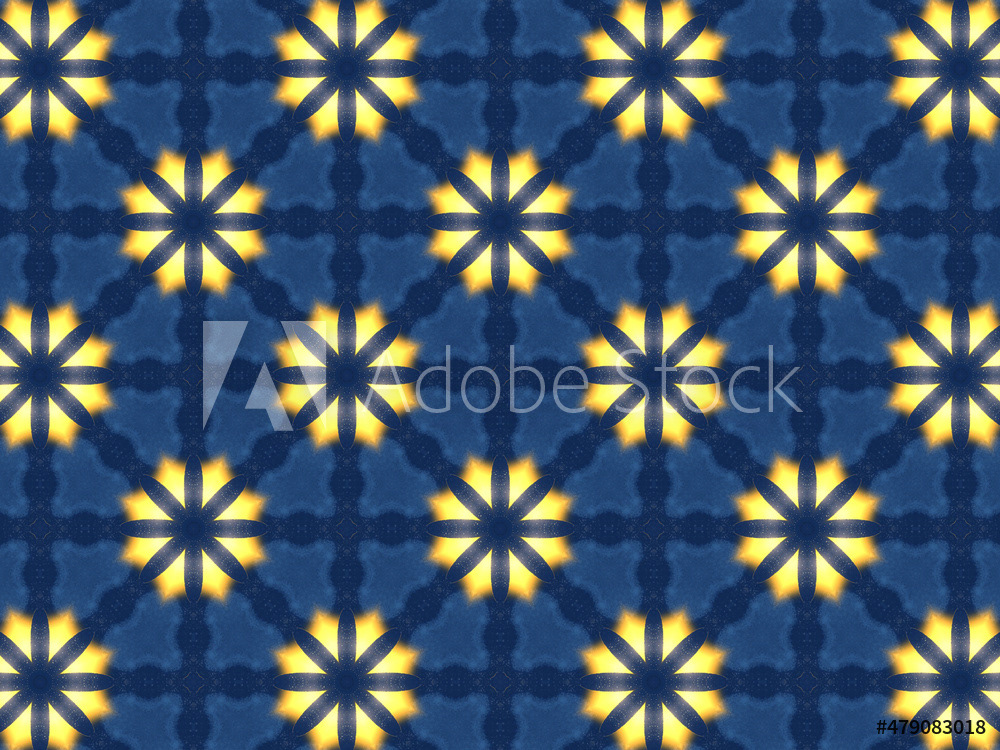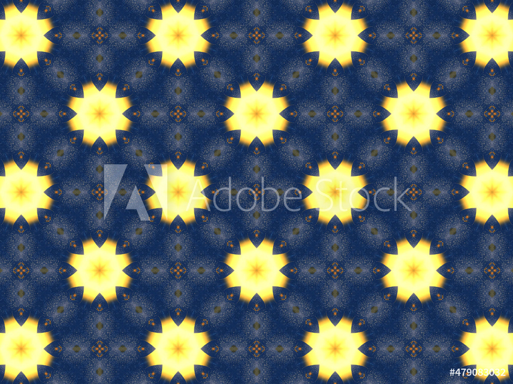 Repeating kaleidoscopic textile patterns with abstract flowers and flashing light effects in yellow/navy color palette. Concept of night and day, the dark and the light.