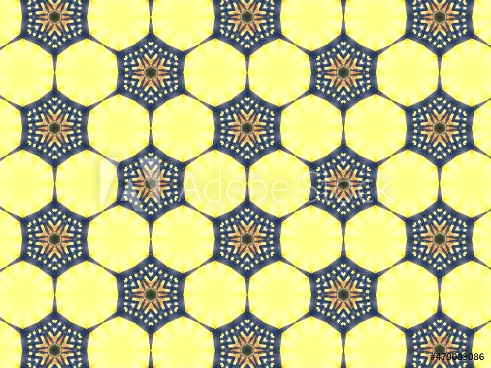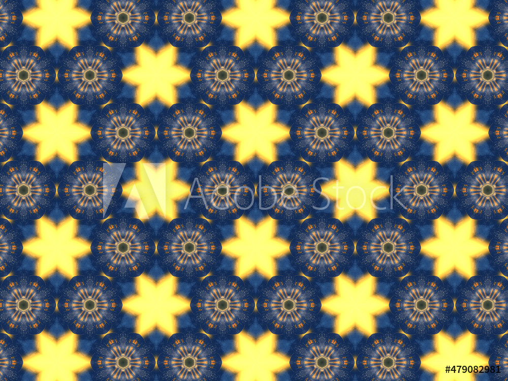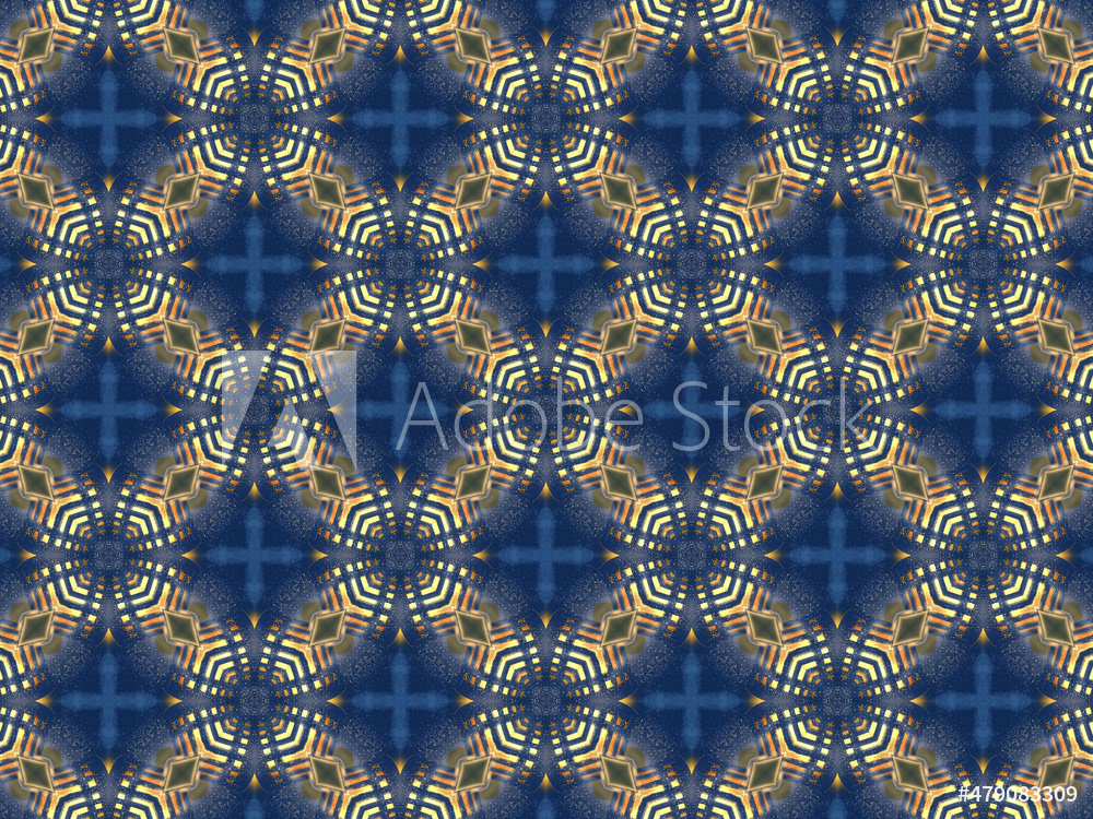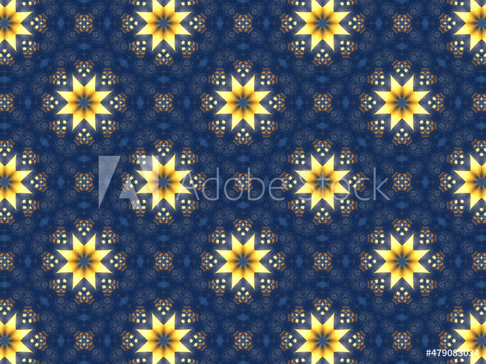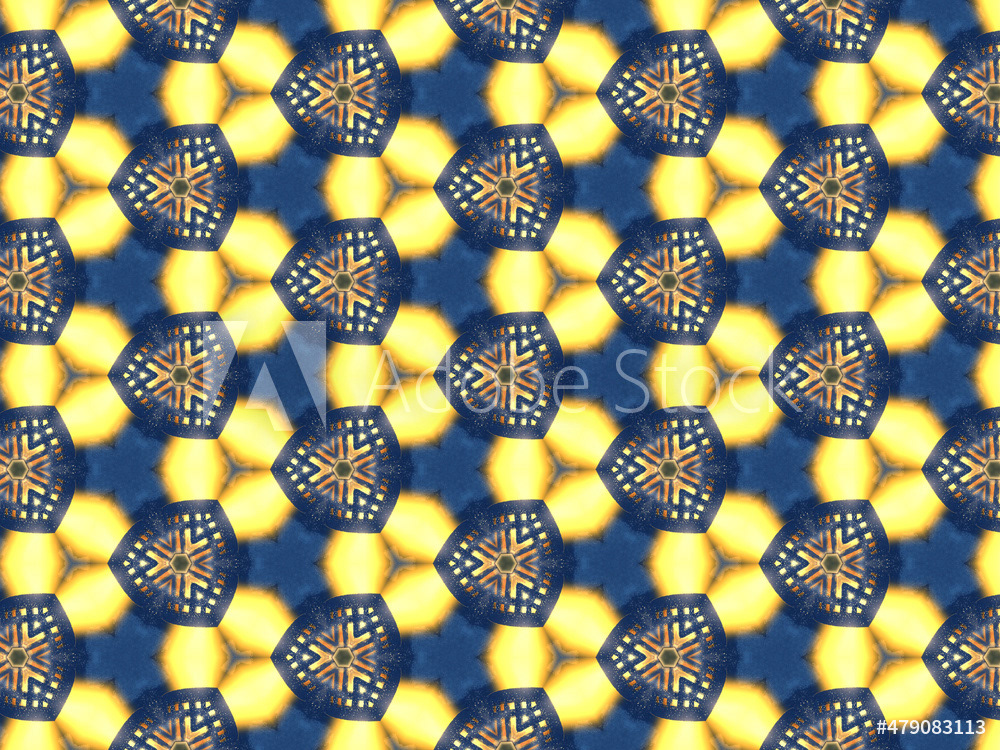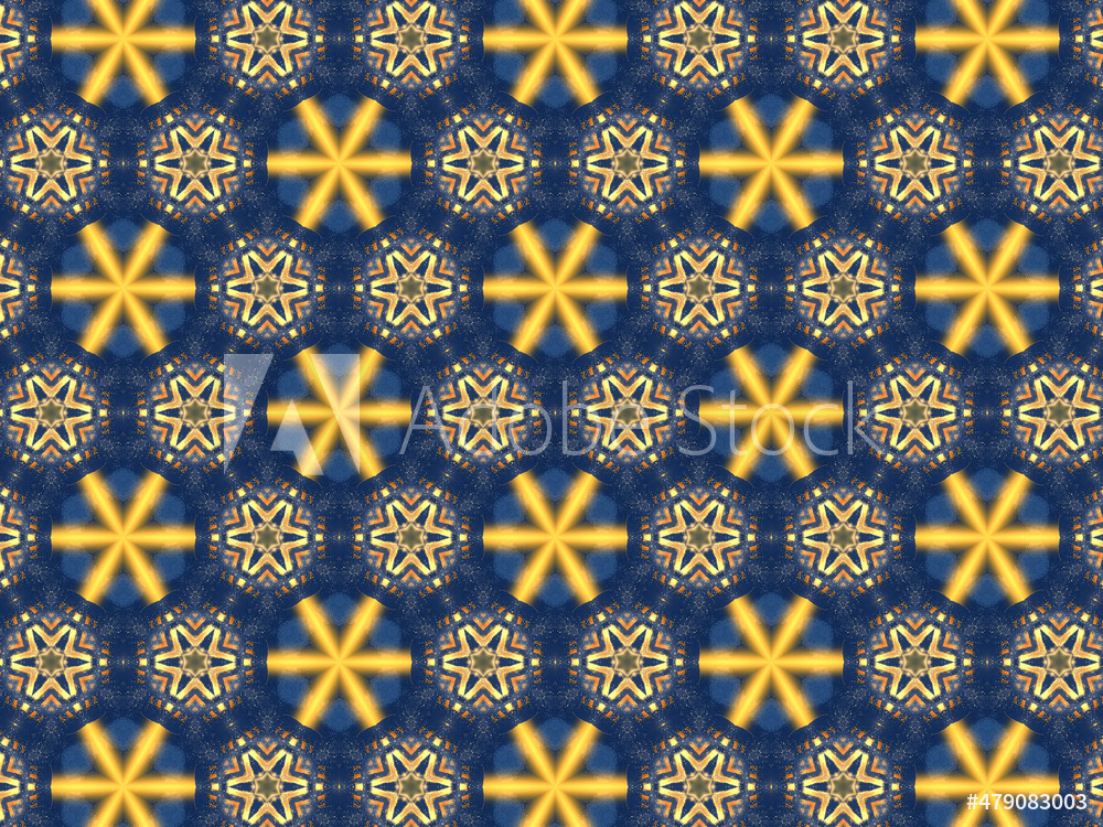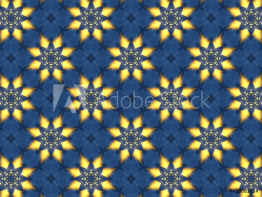 Repeating kaleidoscopic textile patterns with abstract flowers and flashing light effects in yellow/navy color palette. Concept of night and day, the dark and the light.