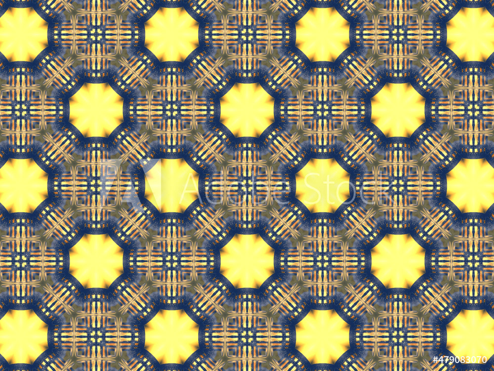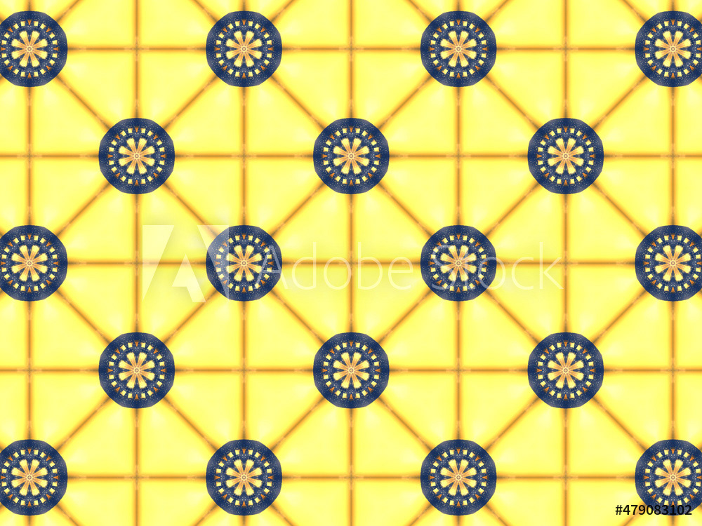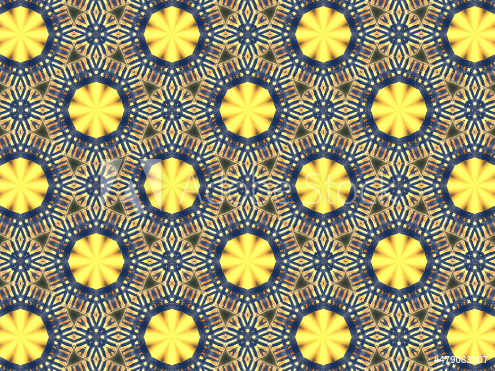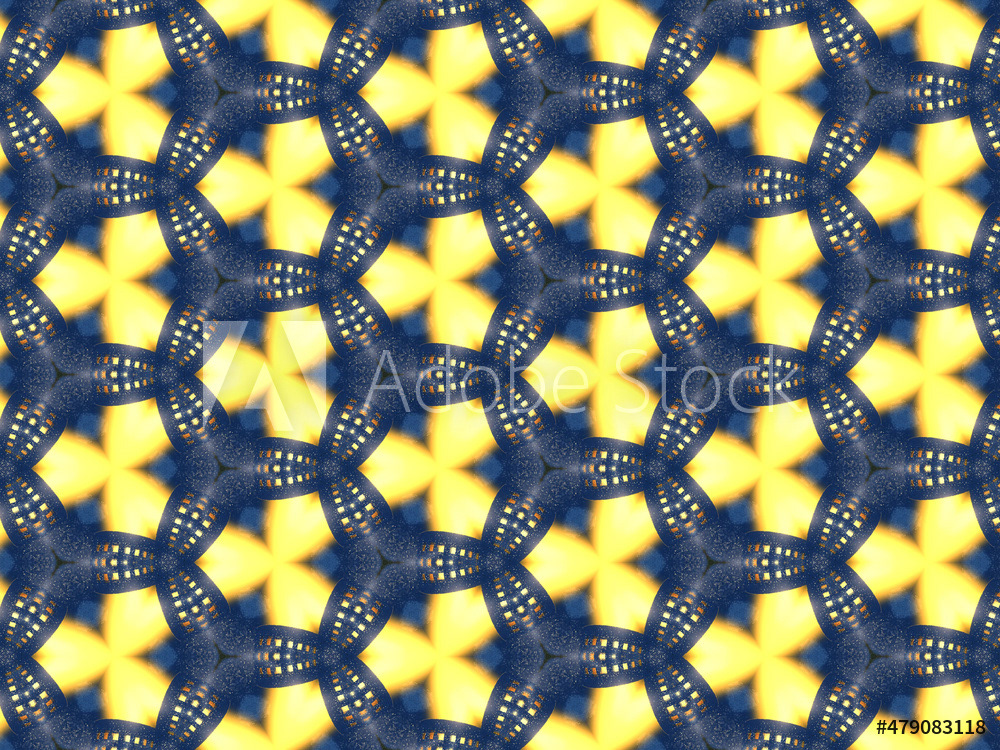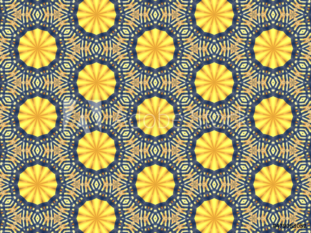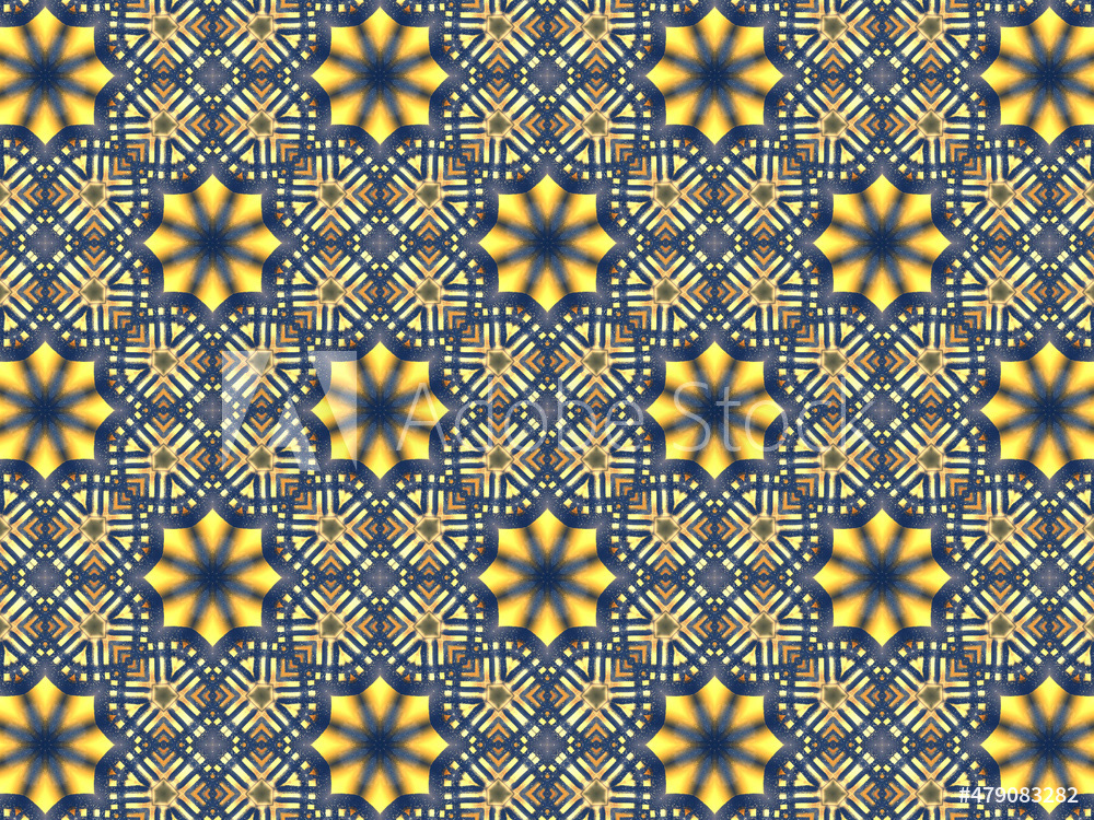 Repeating kaleidoscopic textile patterns with abstract flowers and flashing light effects in yellow/navy color palette. Concept of night and day, the dark and the light.