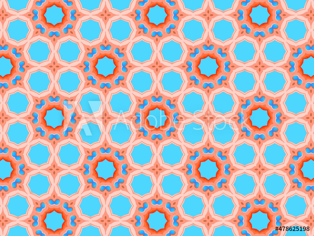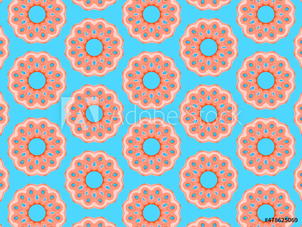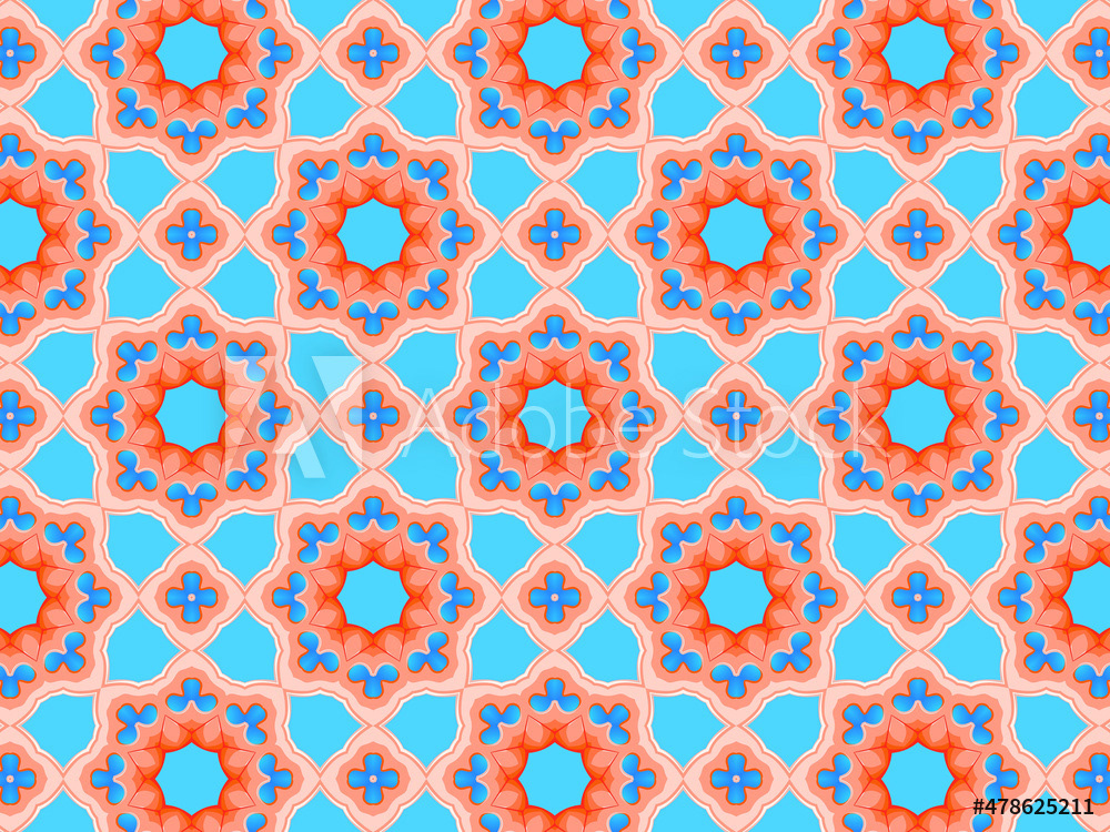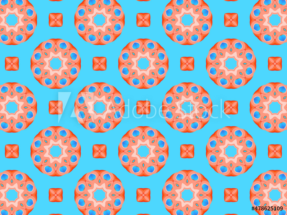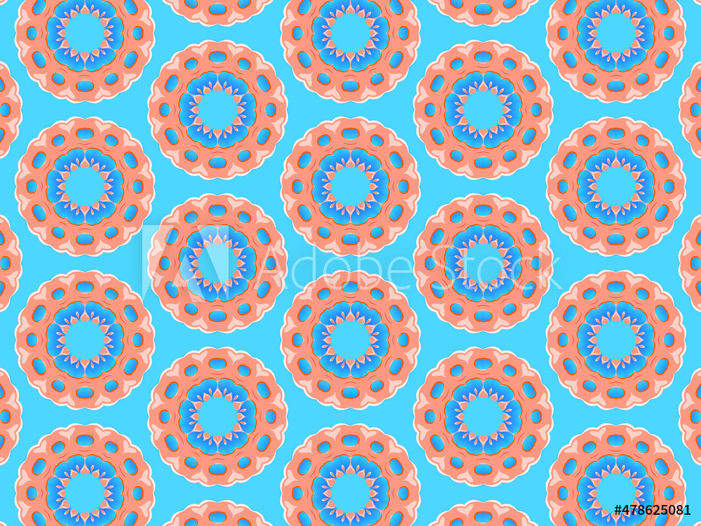 Simple repeating patterns with pink and orange abstract flowers and circles on a blue background, inspired by Eastern ornaments.