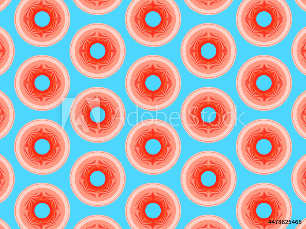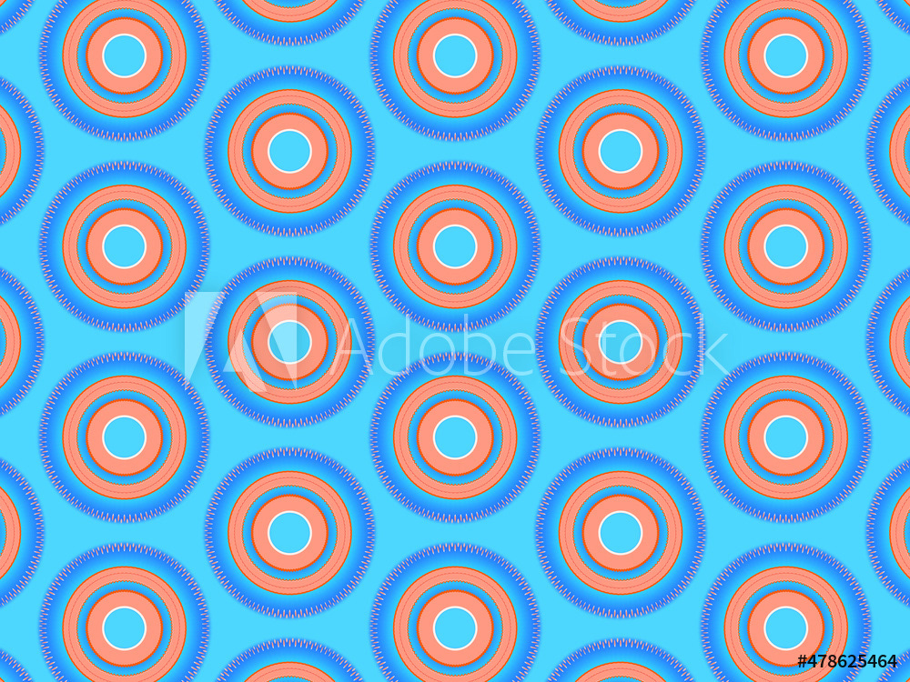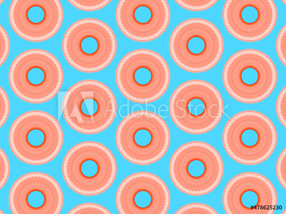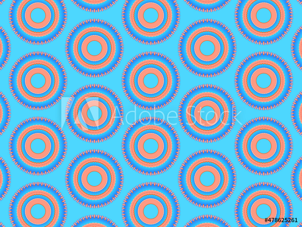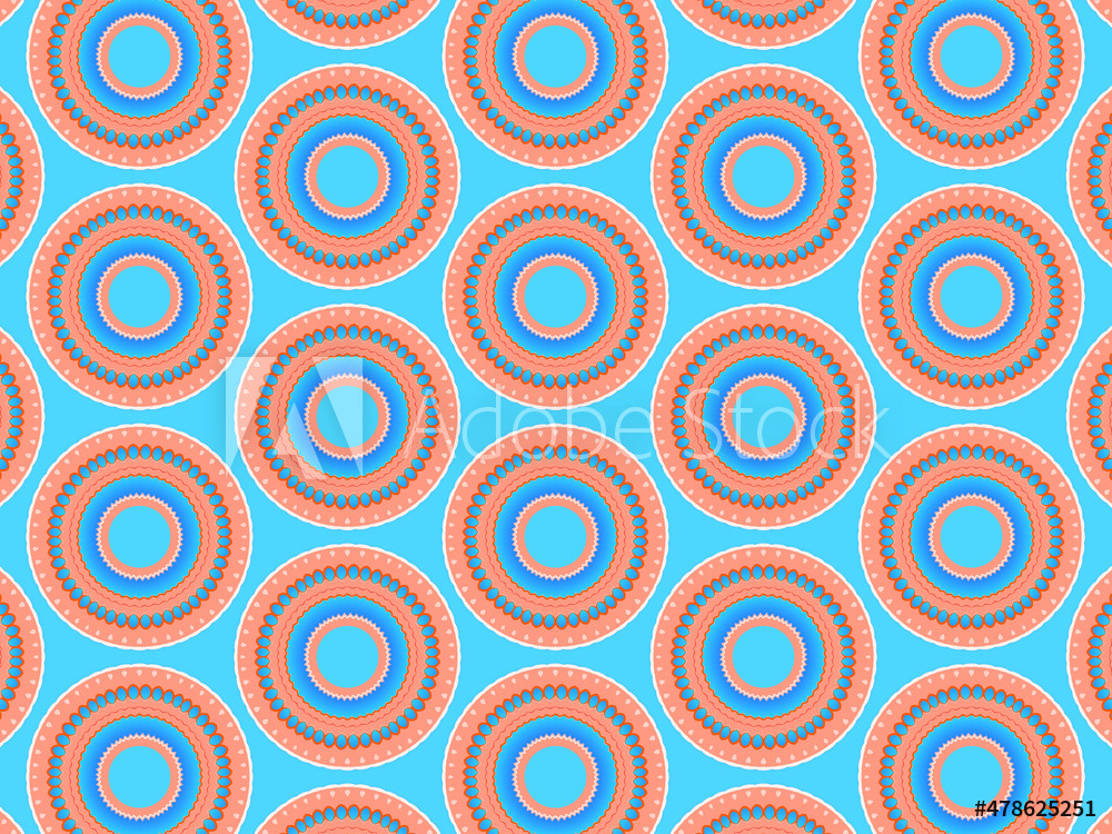 Simple repeating patterns with pink and orange abstract flowers and circles on a blue background, inspired by Eastern ornaments.