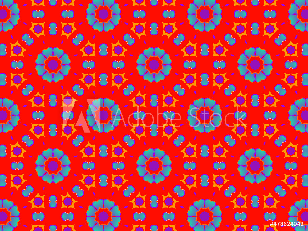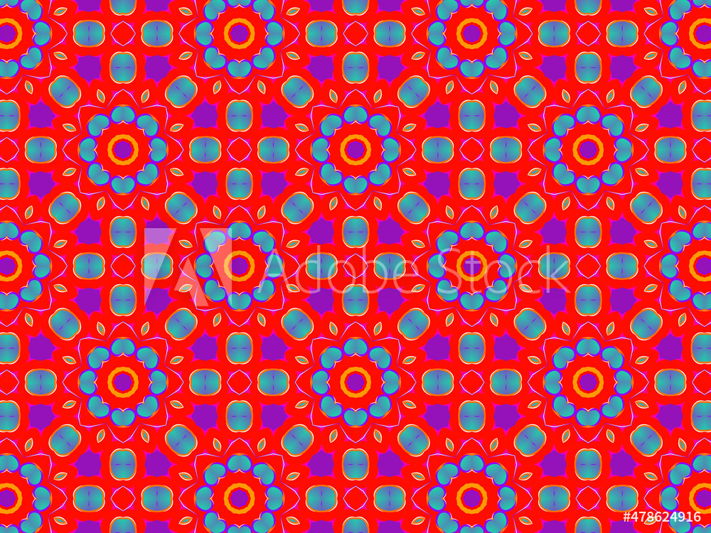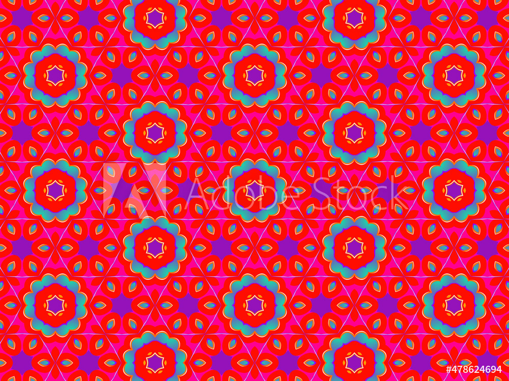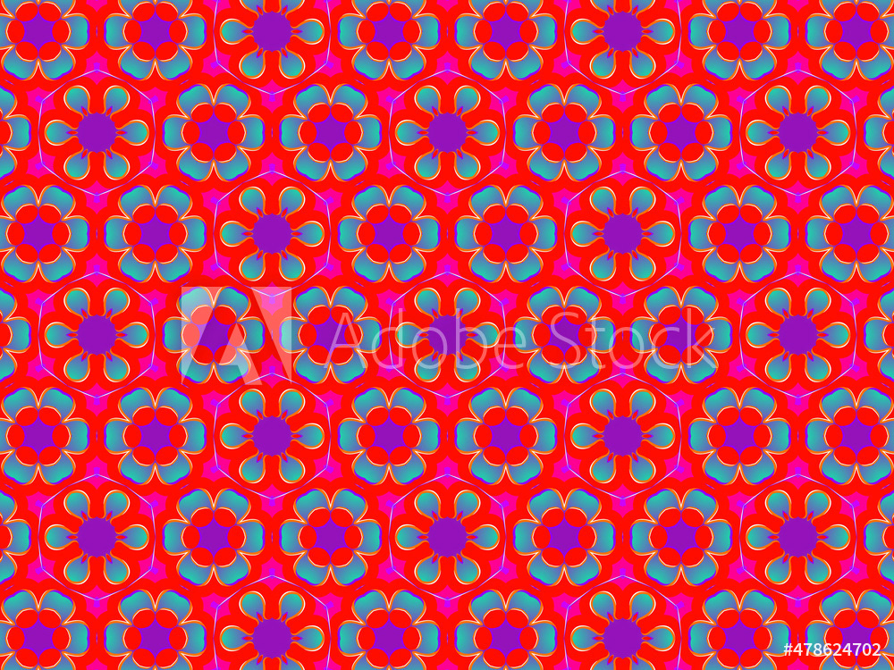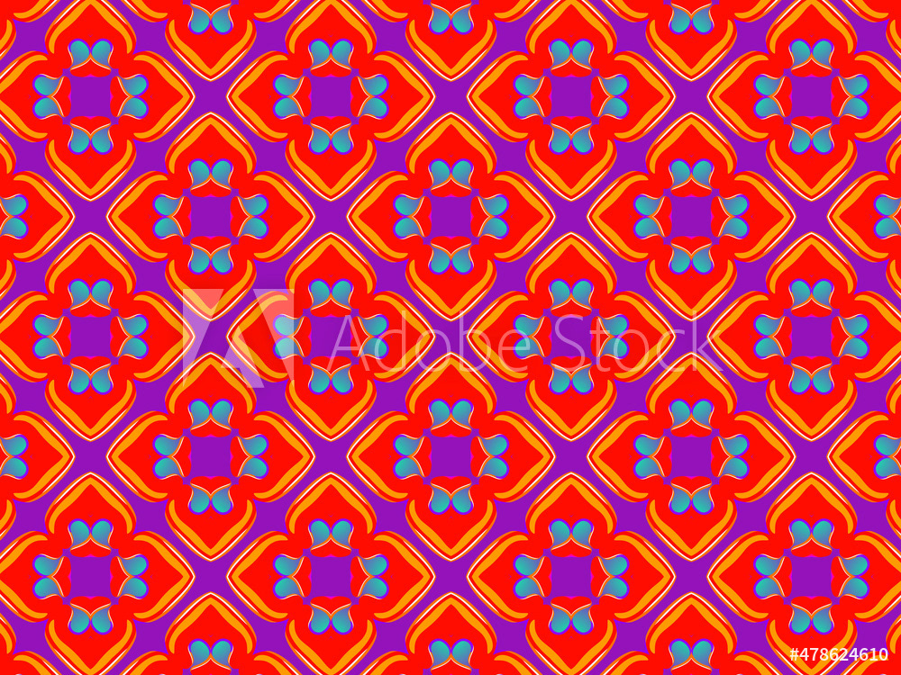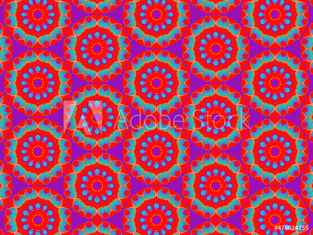 Colorful and vibrant repeating surface pattern in red, purple, teal and blue. Energetic, hypnotic and positive. Concept of passion, sex appeal, love and enchantment.