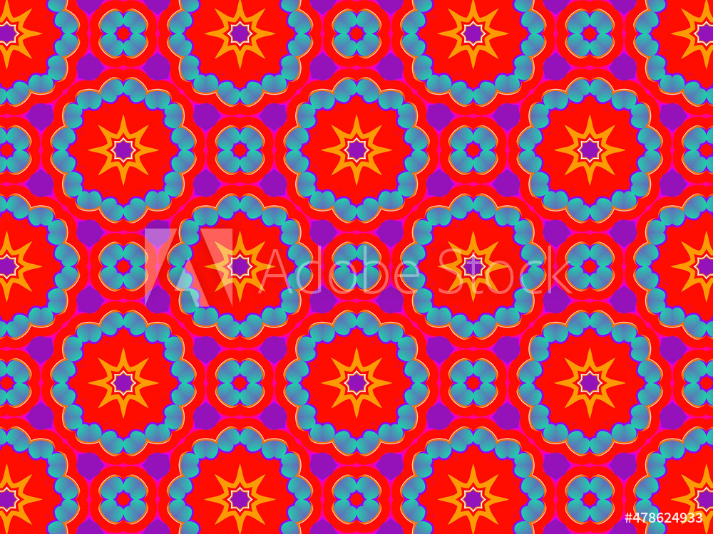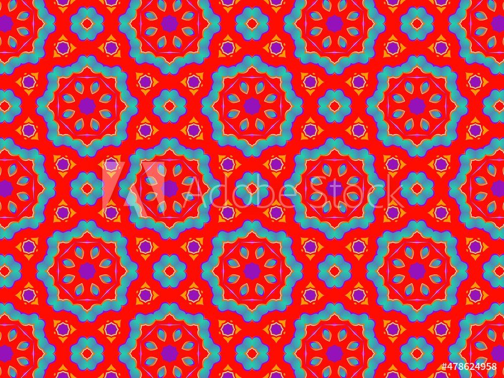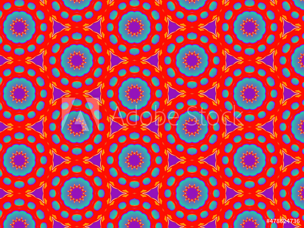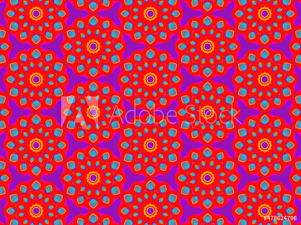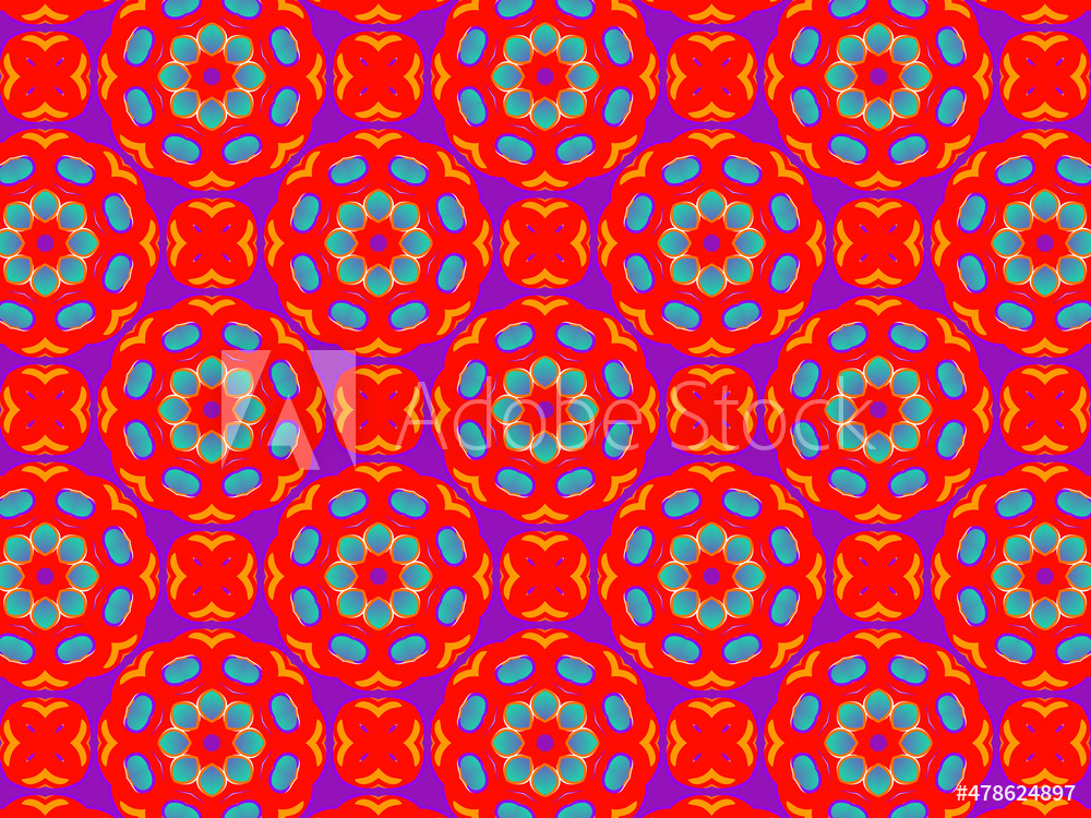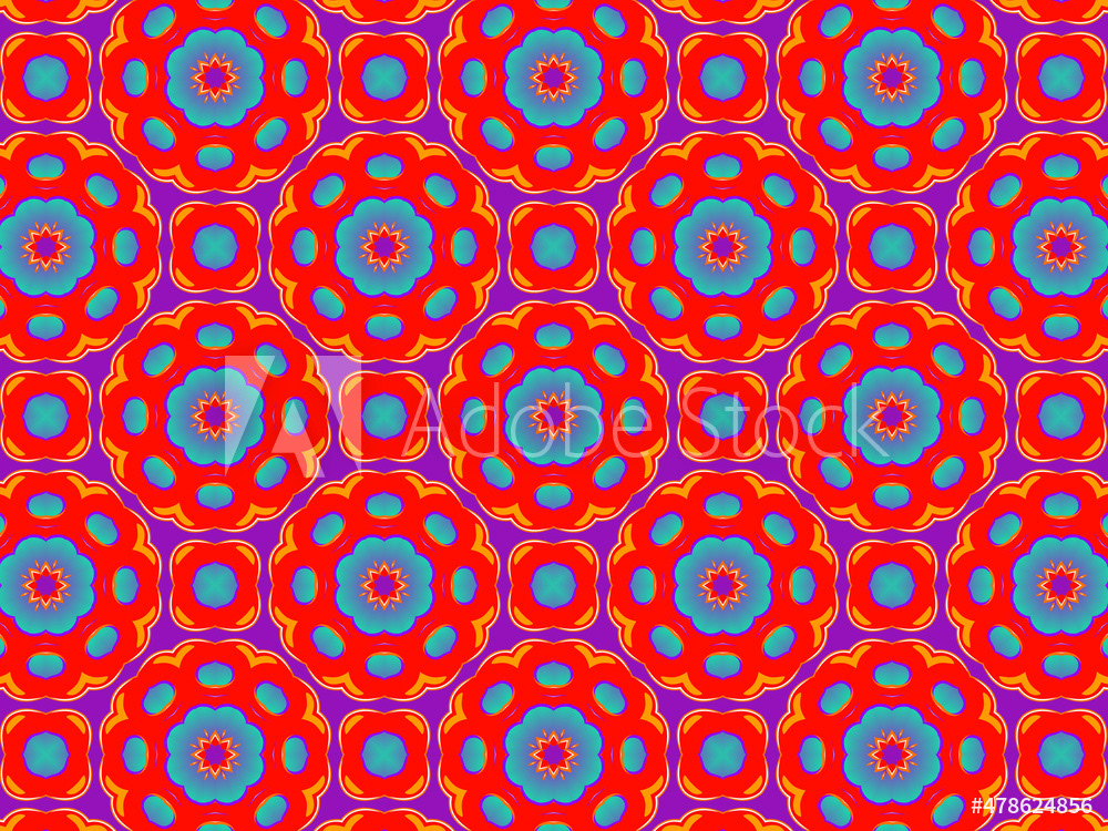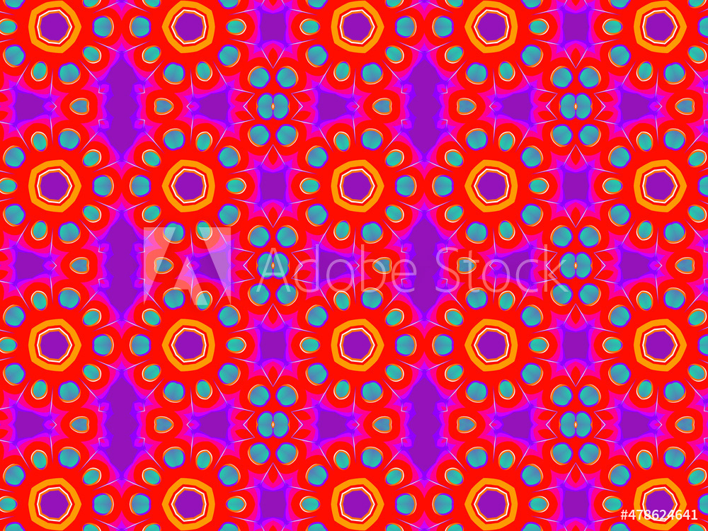 Colorful and vibrant repeating surface pattern in red, purple, teal and blue. Energetic, hypnotic and positive. Concept of passion, sex appeal, love and enchantment.