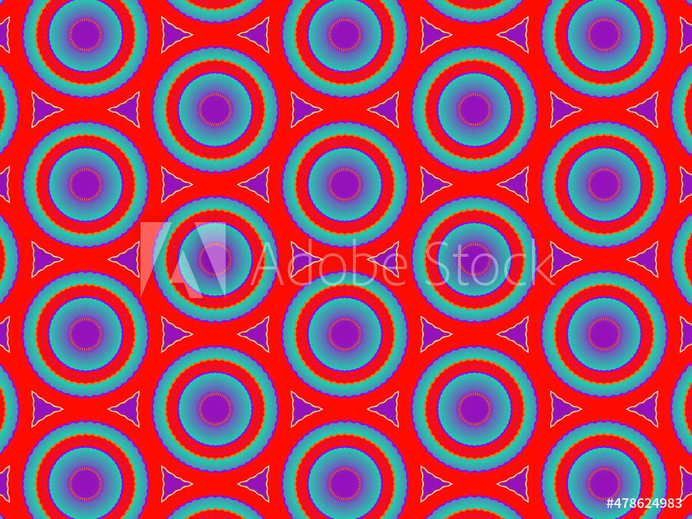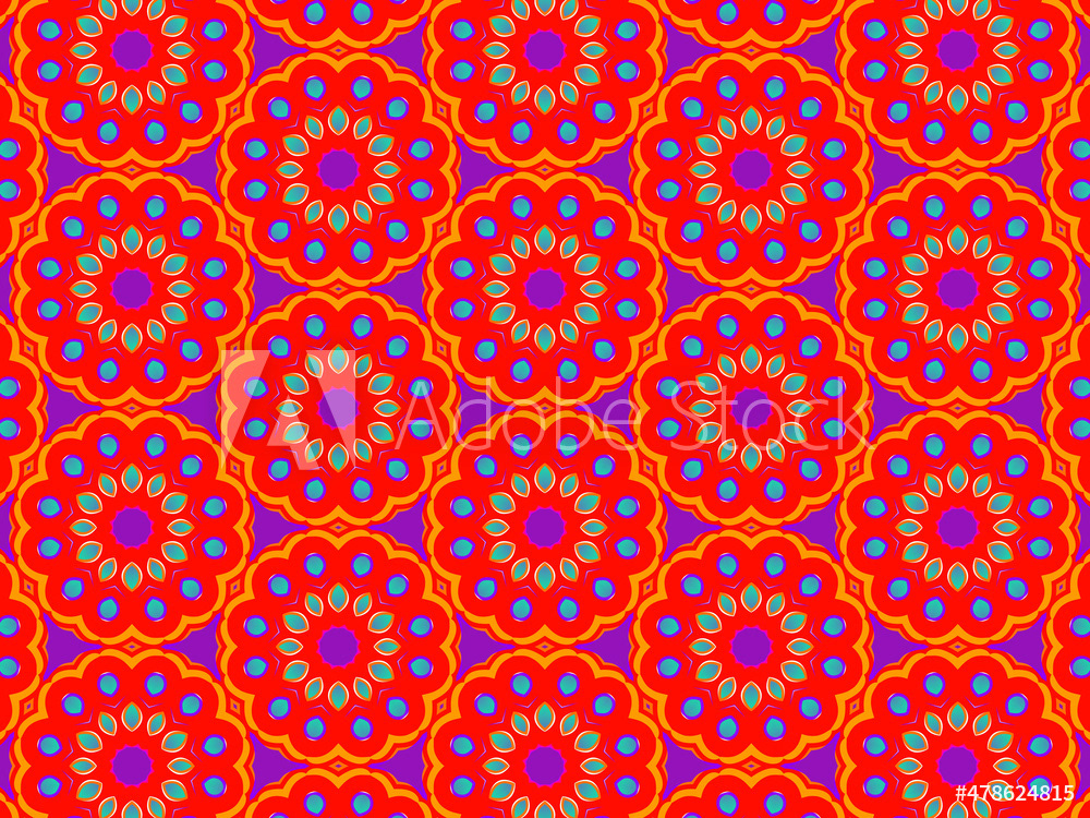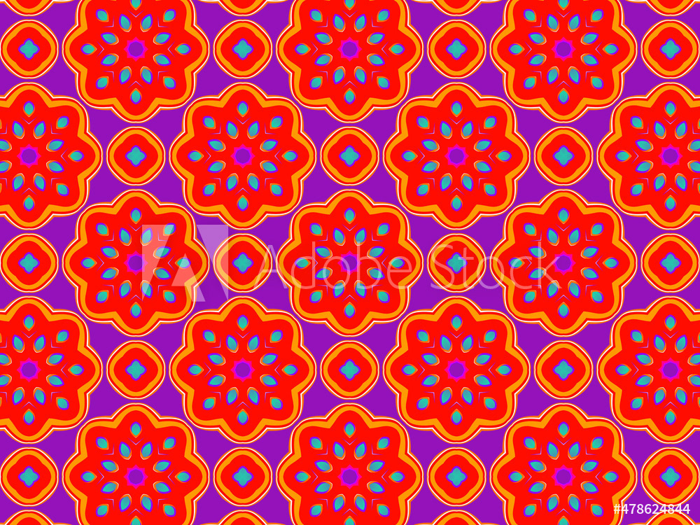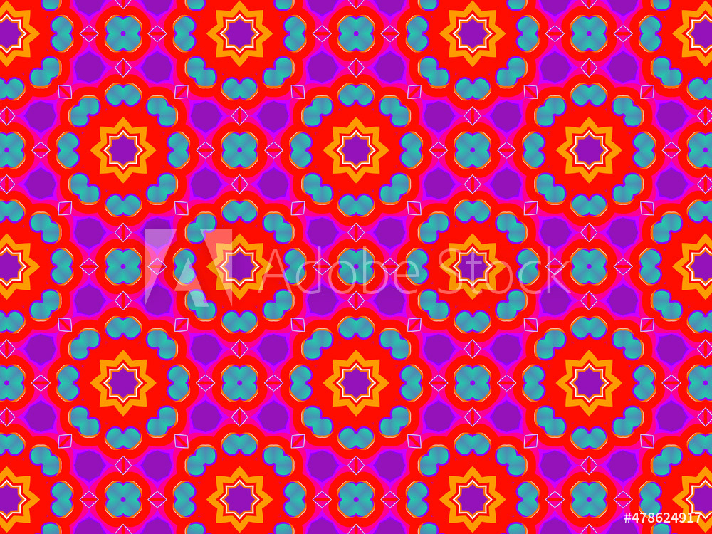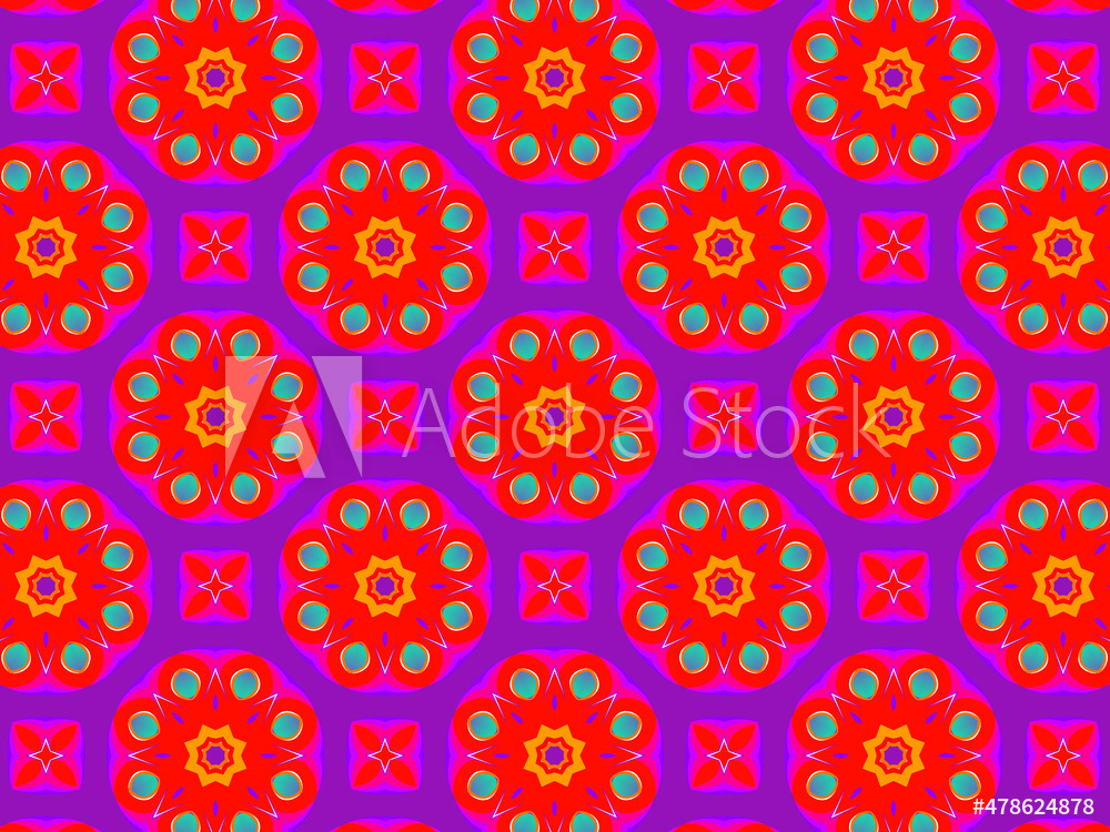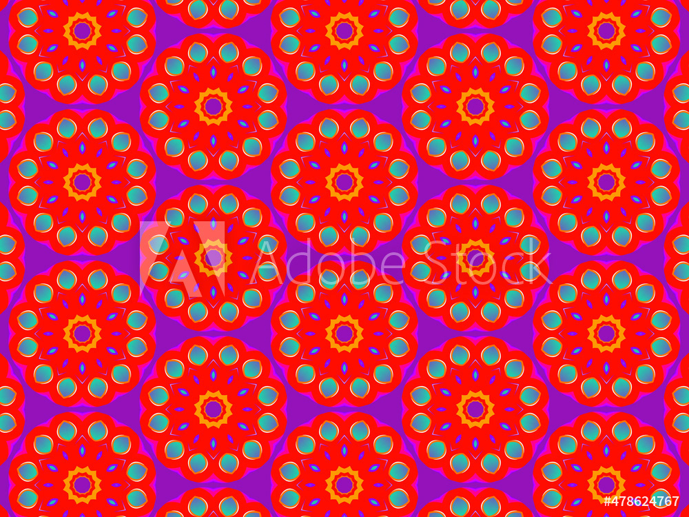 Colorful and vibrant repeating surface pattern in red, purple, teal and blue. Energetic, hypnotic and positive. Concept of passion, sex appeal, love and enchantment.