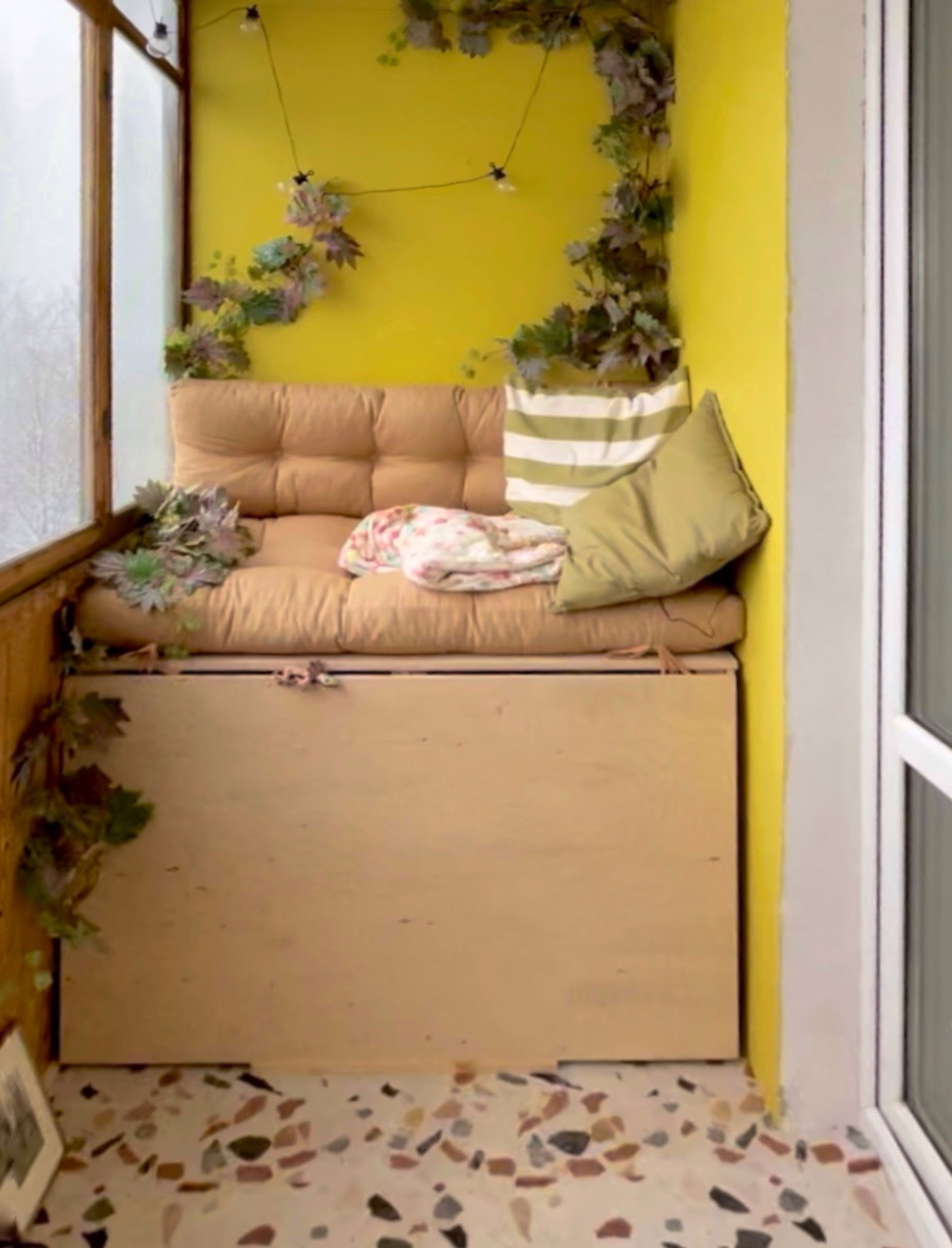 Среди прочего, мне нужно было разместить на лоджии место хранения автошин диаметром около 75 см (R17), и я придумала для них ящик 80х80х115 см вдоль противоположной (относительно шкафа) стены, от стены до окна, справа от выхода на лоджию из спальни. Не нашла бюджетный вариант изготовления такого ящика, и сделала его сама из фанерных листов. Позже распилила фасад на две части и украсила рейками.