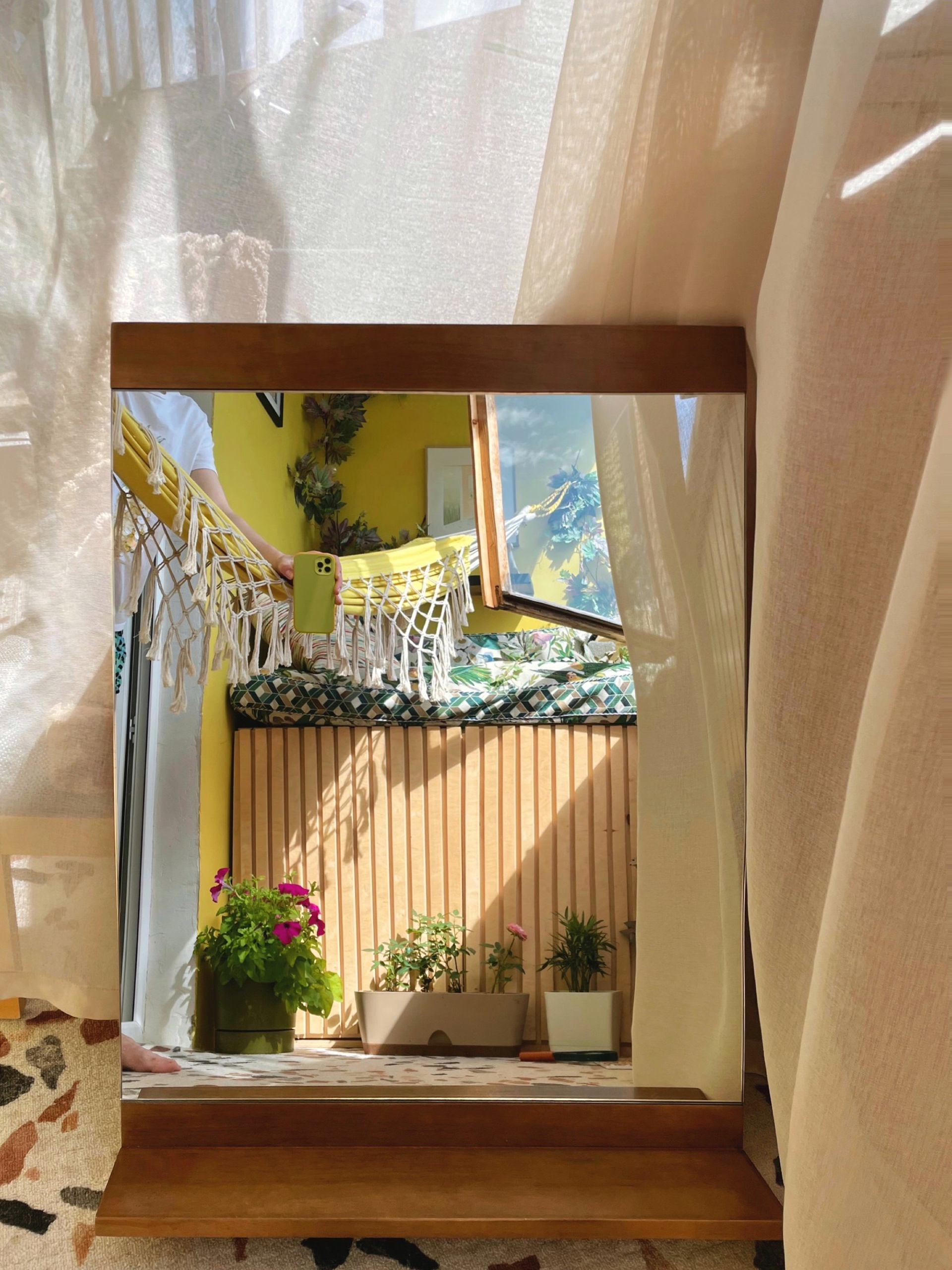 В теплое время года гамак – основное место притяжения на лоджии, мы с мужем даже шутим, что надо завести табличку в облаке и записываться в гамачные слоты, – так он у нас популярен. Хорошо, что он любит здесь загорать, а я, наоборот, – отдыхать в тени (это мое любимое место для разбора и монтажа видео на телефоне).