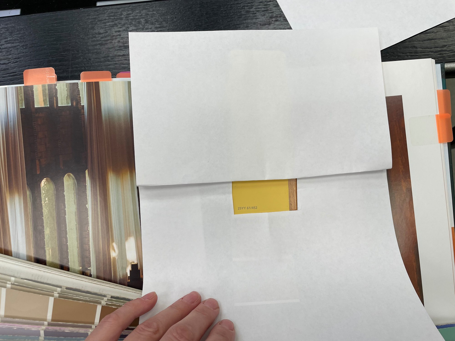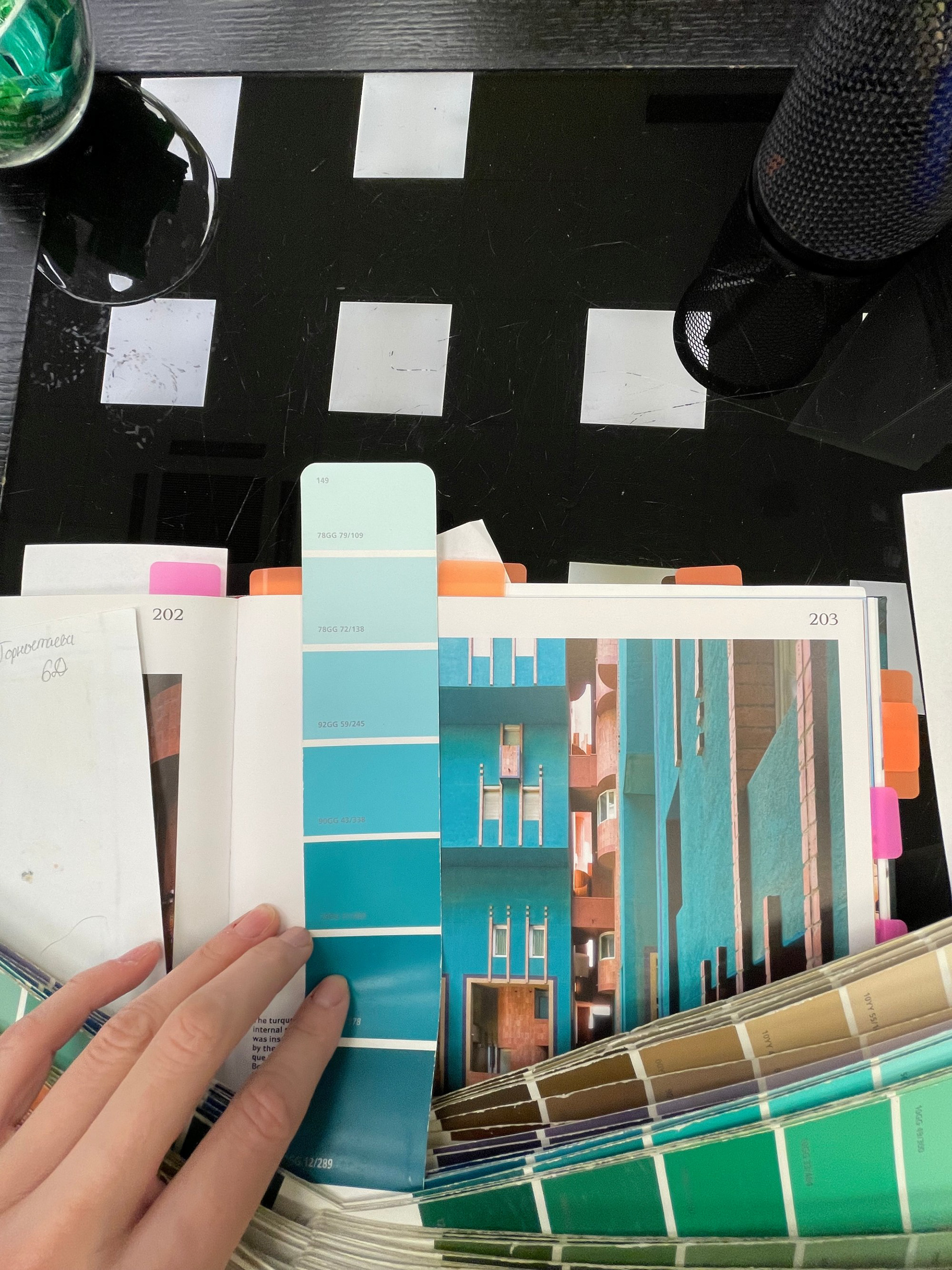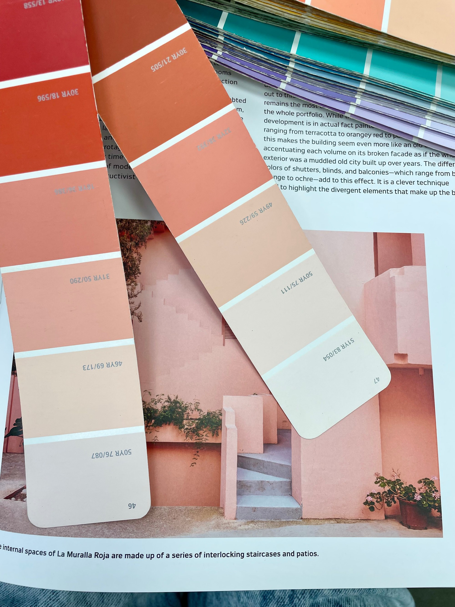 На этом этапе у меня было две цветовые "константы", к которым нужно было подобрать цвет стен: ковролин и старая деревянная вагонка, которую было решено пока не менять, как и окна. Из забавного: для подбора цвета я приложила ковролин к вагонке, сверху расположила книгу о работах своего любимого архитектора – Рикардо Бофилла – и полистала страницы с фото. Так у меня определились фавориты.